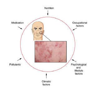 Zanieczyszczenia powietrza wywierają szkodliwy wpływ na skórę, zwiększając stres oksydacyjny (nadmiar wolnych rodników). Zjawisko to jest bardziej nasilone u pacjentów ze skórą trądzikową niż ze skórą niezmienioną chorobowo, ze względu na obniżony poziom witaminy E, niedobór kwasu linolowego oraz utleniony skwalen. Pomimo to potrzebne są dalsze badania, aby lepiej zrozumieć związek między zanieczyszczeniem powietrza, a występowaniem danej dermatozy.