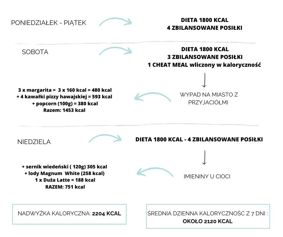 Nadwyżka kaloryczna z weekendu spowodowała, że średnia dzienna kaloryczność nie wynosiła już 1800 kcal (deficyt energetyczny), a około 2120 kcal – co spowodowało brak efektów na wadze.