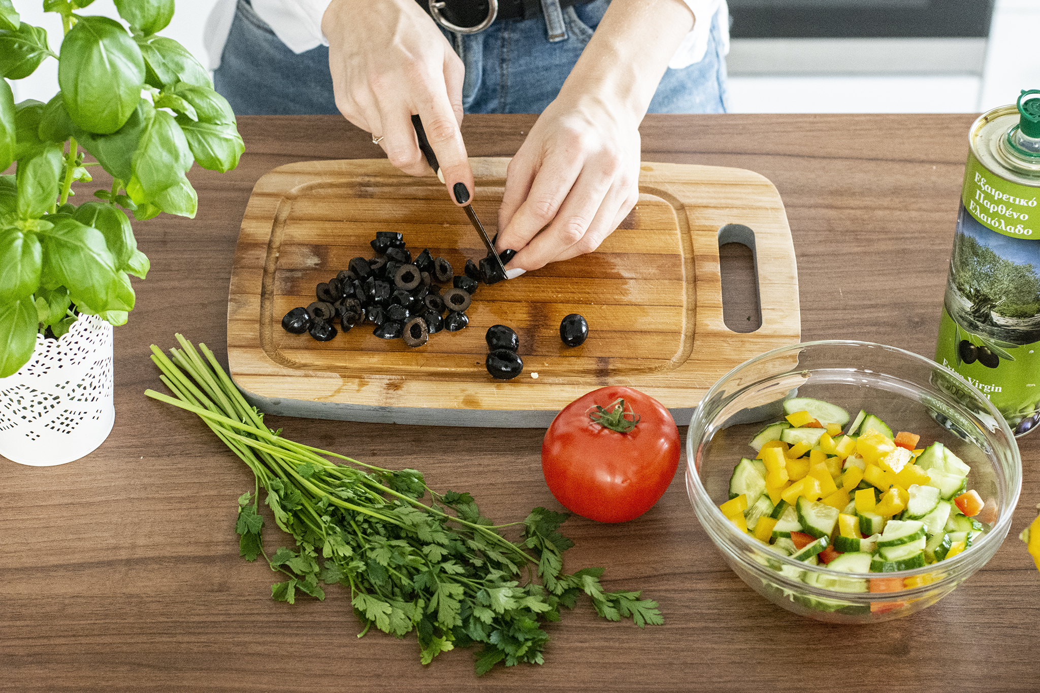 5) Wierzch sałatki udekoruj pokrojonym w kostkę serem feta oraz posiekaną bazylią.