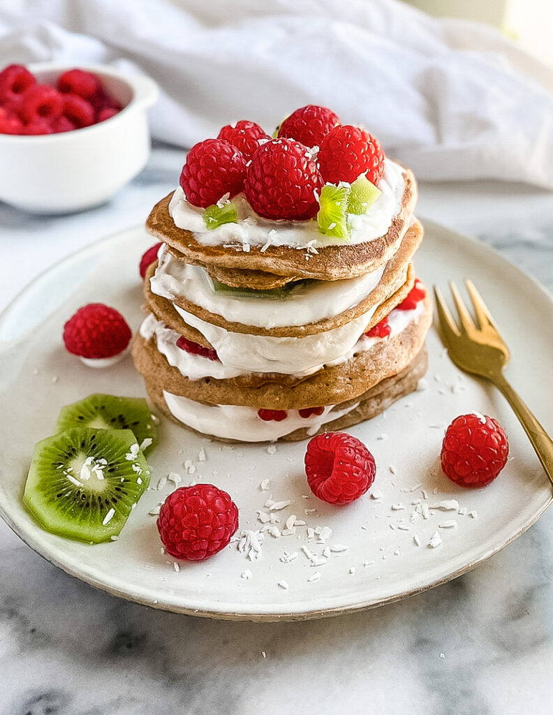 Waniliowe orkiszowe pancakes z owocami i jogurtem kokosowym